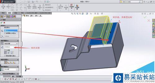 5、順帶講一下鈑金的轉折命令,在需要轉折的板面位置做一條草圖直線,按圖所示選擇轉折深度