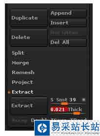 3、單擊Tool>SubTool(工具>子物體工具)命令,在展開SubTool(子物體工具)面板,將Thick(厚度)設置為0.2,單擊Extract(抽出)按鈕,對模型腰部進行抽出操作,此時在SubTool(子物體工具)層中就多了一個物體,如下圖(右)所示。