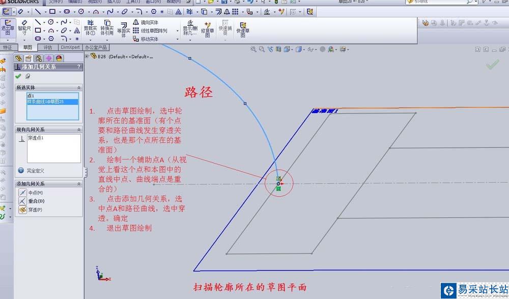 solidworks草圖掃射時候,出現無法添加引導線的現象。要在輪廓平面草圖上添加一個輔助點A,然后讓點A和引導線添加穿透關系,下面我們就來看看這個問題的解決辦法。