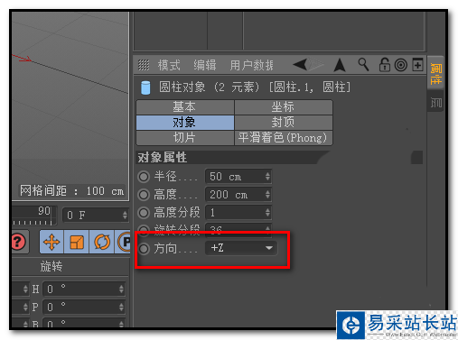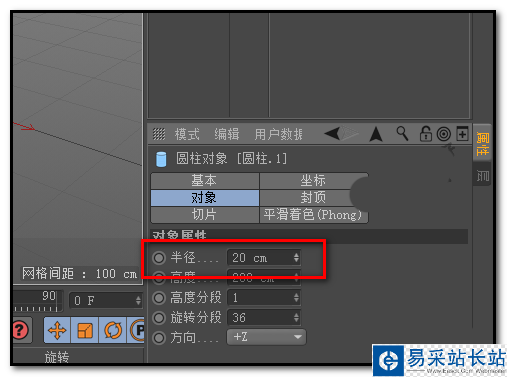 2、調出了對象屬性面板,在面板中,把圓柱體的方向設置為+Z;然后,單獨選中圓柱1對象,把圓柱1物體半徑修改為20