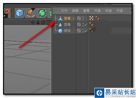 7、這時,對象面板這里,多了一個對象,此對象就是球體與圓錐結合體,現在是在選中狀態。我們在視圖這里,把這個結合體移動下。