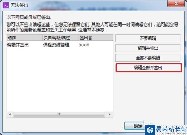 2、可以看到彈出頁面無法簽出,我們選擇“編輯全部并簽出”,如下圖所示: