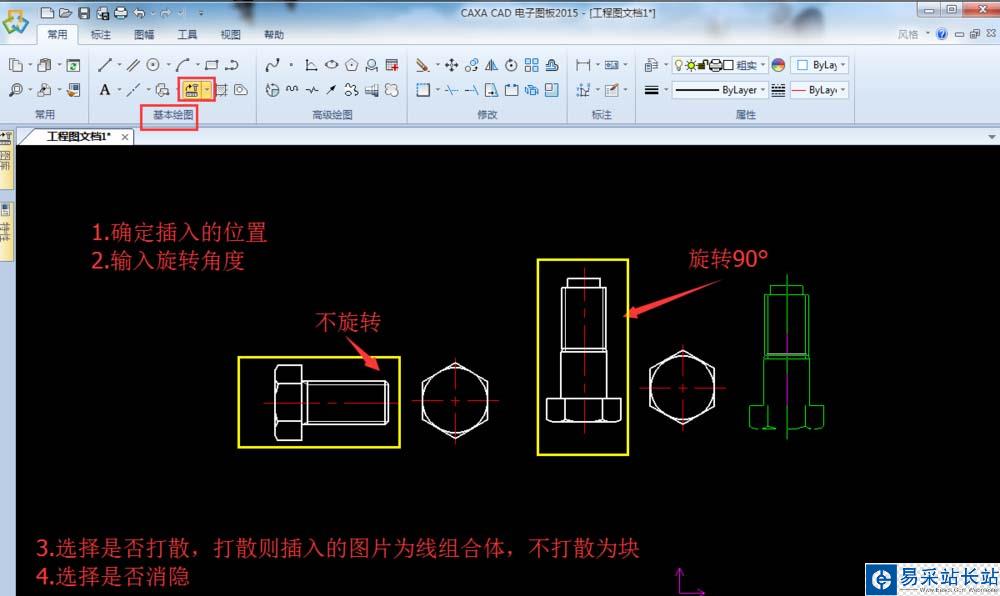6、點擊【完成】后,進入主繪圖界面,鼠標左鍵點擊要插入的位置,然后選擇是否旋轉,如不旋轉,鼠標右鍵確認;如需要旋轉,輸入要旋轉的角度。在左下方還有【打散】和【消隱】選項,選擇【打散】則插入的圖案為線條組合,【不打散】則圖案為塊,是一個整體;【消隱】是為了裝配后隱匿看不見的部分。到此,調用六角頭螺栓就完成了。