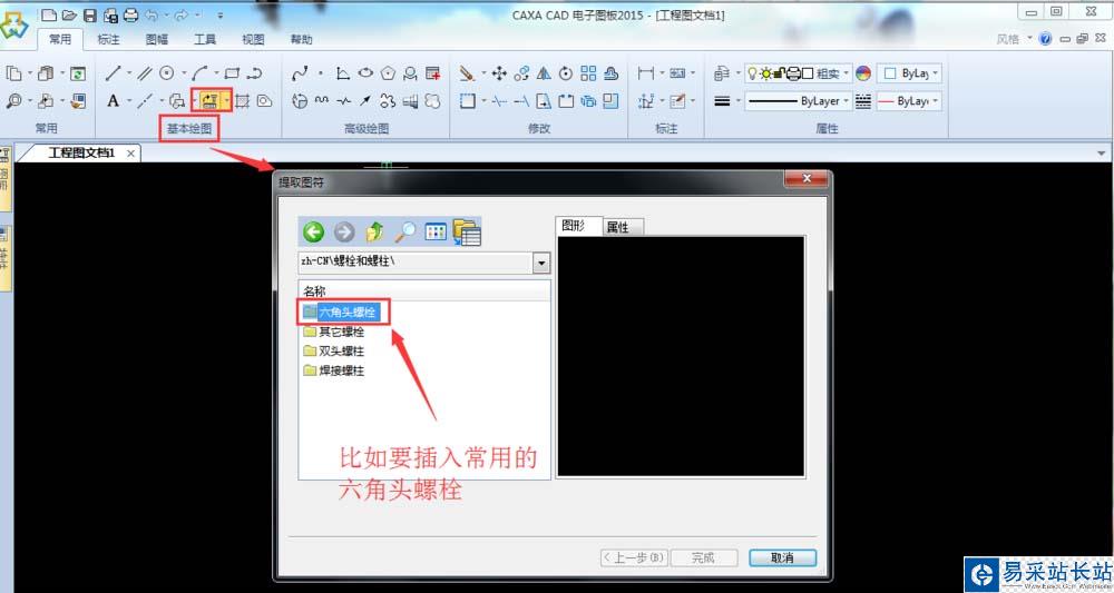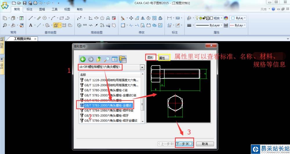 4、在這里有不同國家標準的各類螺栓。用戶根據自己的需要,選擇自己想要調用的螺栓。選擇一種標準后,在右側會顯示其圖形,還可點擊【屬性】查看相關的材料、標準、規格等。選定后,點擊【下一步】。
