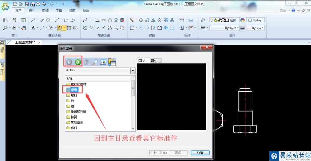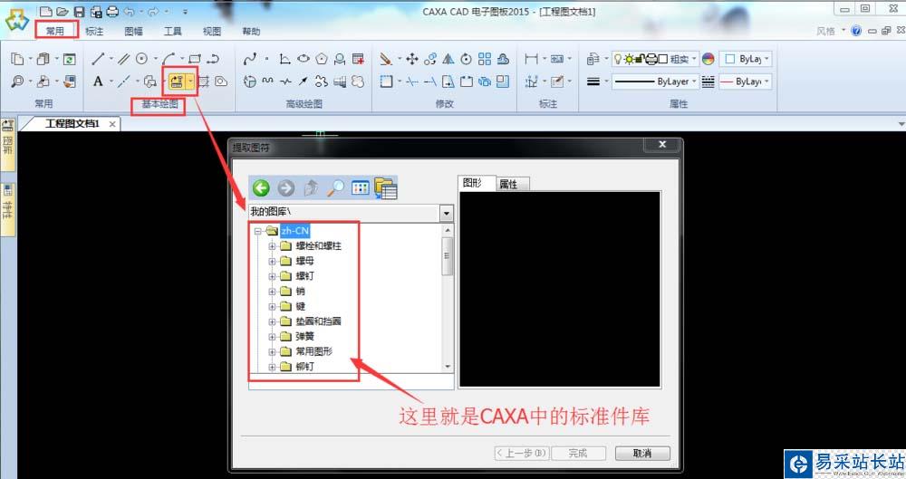 2、點擊【提取圖符】,即可進入CAXA標準零件庫,在這里可以看到有螺栓和螺柱、螺母、螺釘,還有銷、鍵,甚至有法蘭等標準零件。
