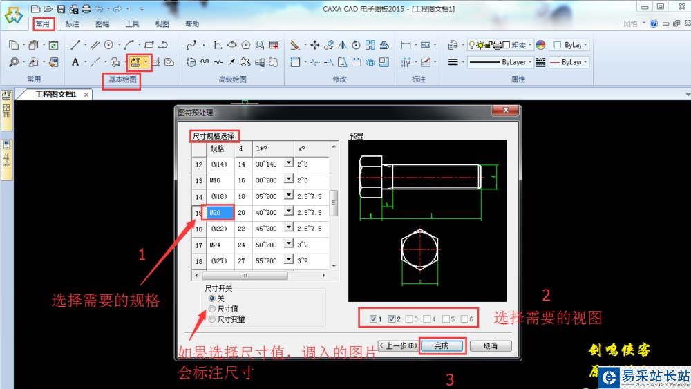 5、這里進入到了選擇尺寸和規格的界面。首選在左側選擇想要的規格,包括螺紋、長度等,然后在圖案下方的數字前勾選需要調入的視圖,點擊【完成】。這里有一個尺寸開關,默認是關,若打開,會在調入的圖中標注尺寸,有標注尺寸值和尺寸變量兩種,根據自己的需求選擇。