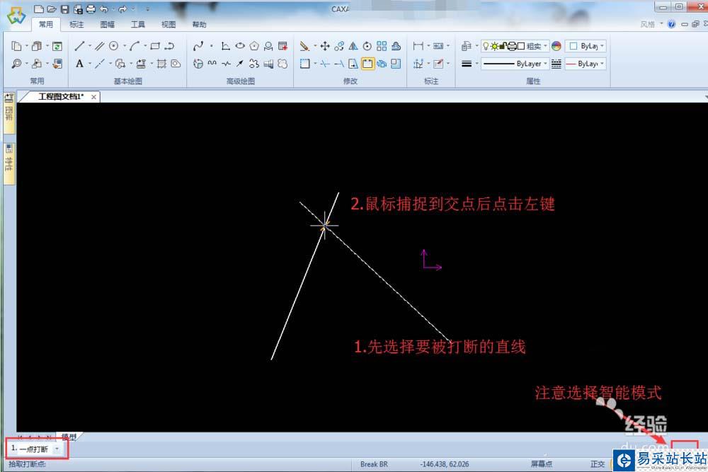 2、選擇要打斷的直線,然后用鼠標捕捉到交點(注意在右下角將模式選擇為智能),捕捉后點擊鼠標左鍵。