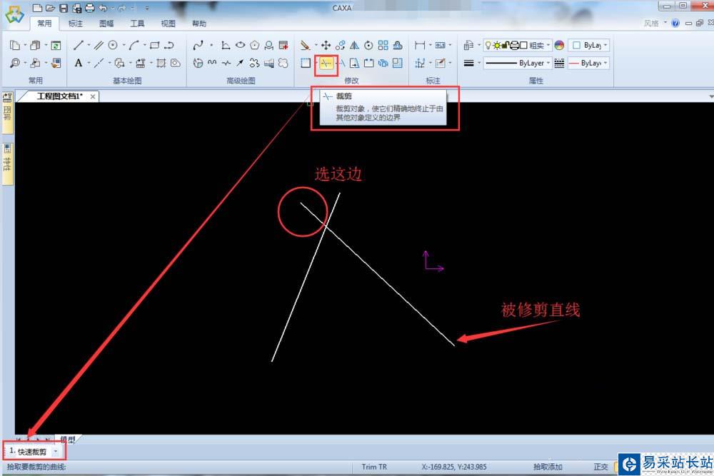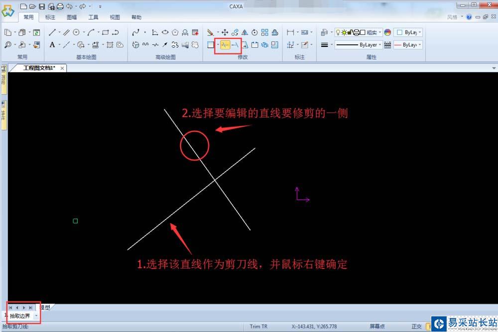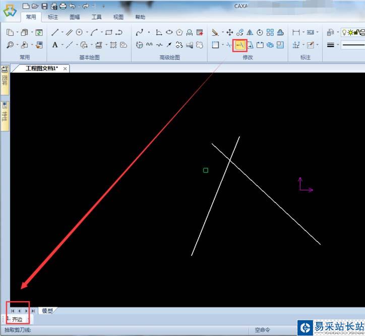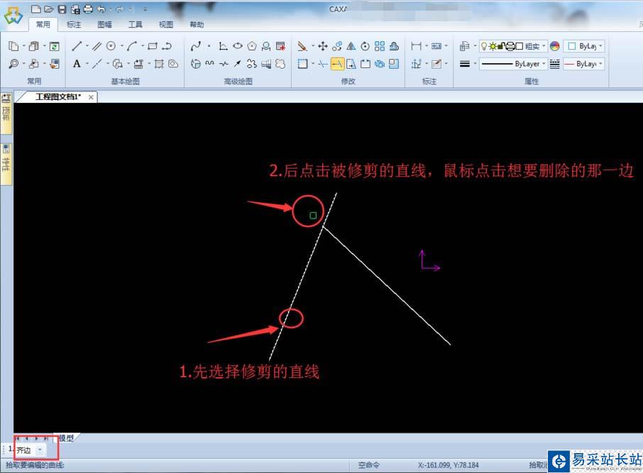2、先選擇用于修剪的剪刀線,再選擇要修剪的直線(想要刪除的一側(cè)),即可完成修剪。當(dāng)然,【齊邊】功能與方法一【裁剪】功能里的【拾取邊界】類似。