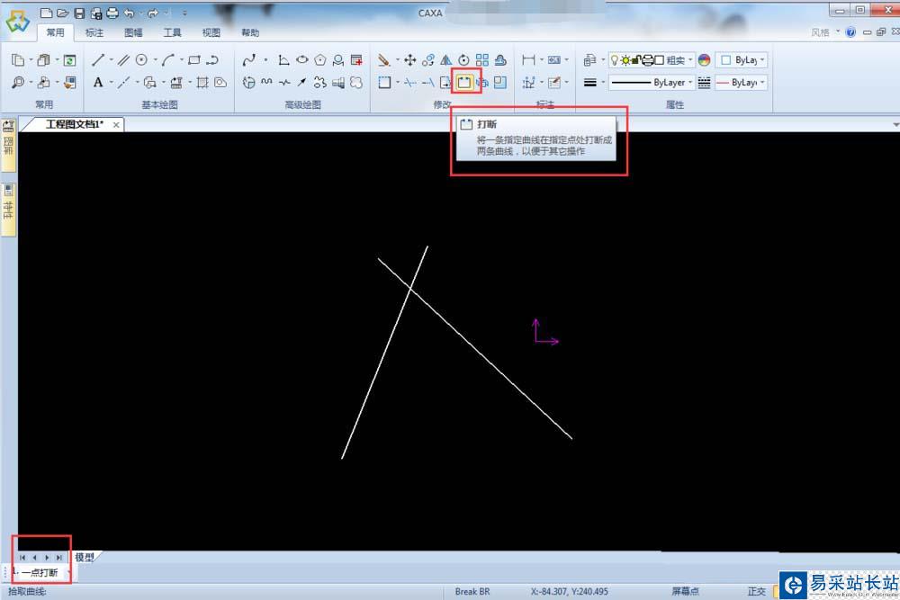 1、在【修改】菜單里找到【打斷】,左下角選擇【一點打斷】。