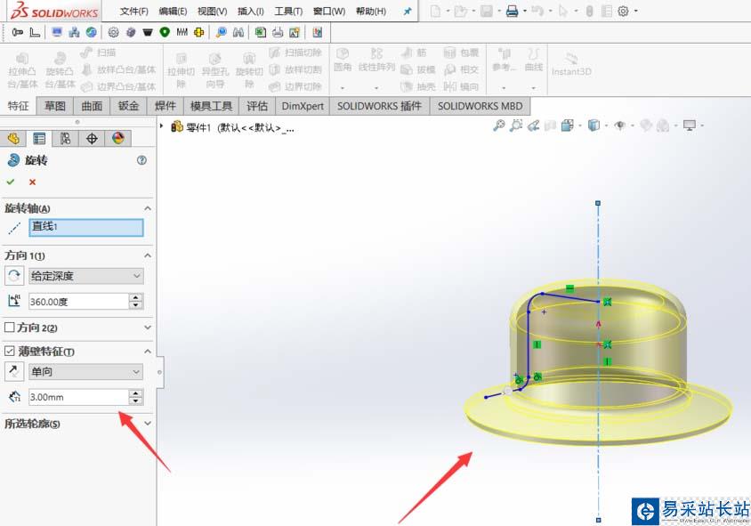 4、然后選擇特征里的旋轉命令,不需要閉環旋轉,直接開環旋轉即可,這樣得到的是薄壁。