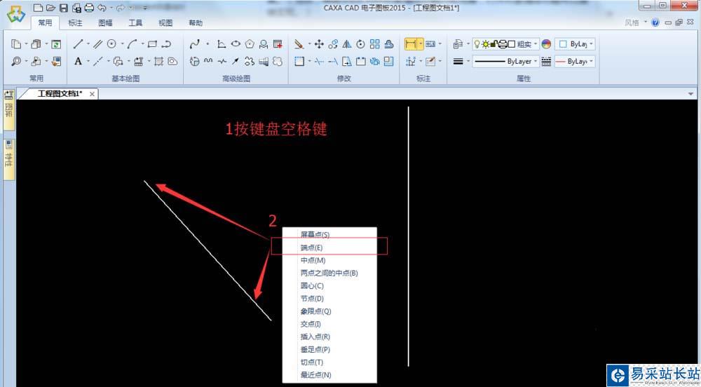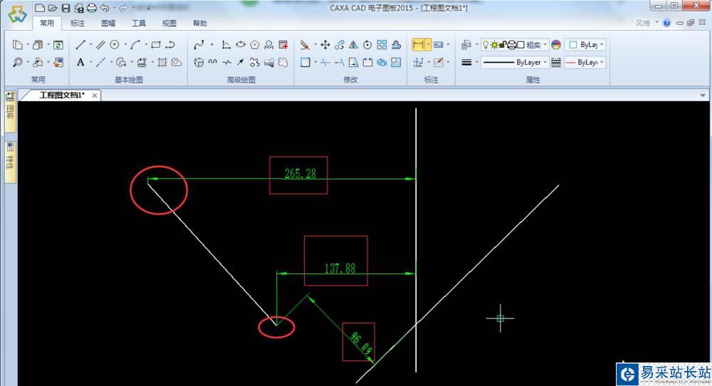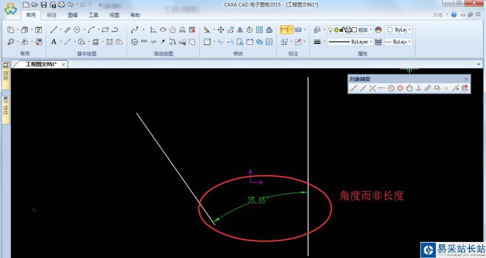 2、對于不平行的兩條直線,對于版本較低的CAXA圖版,當(dāng)要標(biāo)注一條直線的端點(diǎn)到另一條直線的距離時,往往會標(biāo)注出兩條直線的夾角,而非端點(diǎn)到直線的距離。(當(dāng)然,高版本的CAXA對象捕捉功能比較完善,打開對象捕捉功能可以直接實(shí)現(xiàn)。)