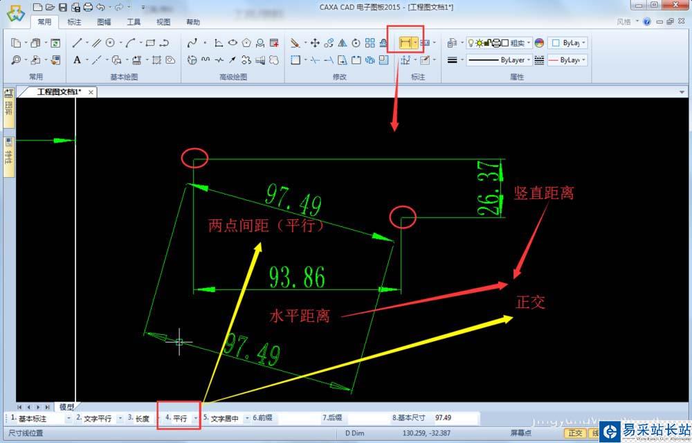 1、孤立兩點(diǎn)間的距離標(biāo)注比較簡單,為了方法完整性,這里簡單介紹。選擇【尺寸標(biāo)注】,依次選擇第一個和第二個點(diǎn),當(dāng)鼠標(biāo)上下移動后確定時,標(biāo)注的為水平距離;當(dāng)鼠標(biāo)左右移動后確定時,標(biāo)注的是豎直距離;要標(biāo)注兩點(diǎn)間距(直線距離)時,需要在標(biāo)注時,在左下方將標(biāo)注狀態(tài)從【正交】改為平行即可成為兩點(diǎn)距離。