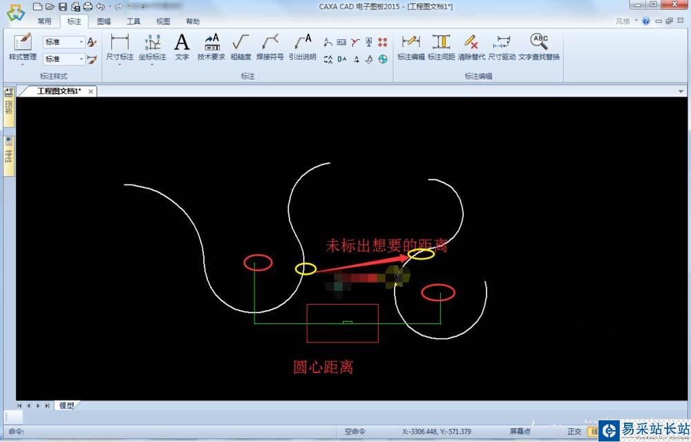 1、有時,當(dāng)存在一些相切的線條而需要進(jìn)行標(biāo)注兩點(diǎn)距離時,往往選不到自己想要選擇的部位,例如,要標(biāo)注下圖中兩個切點(diǎn)間的距離時,選擇圓弧后往往會標(biāo)注為兩個圓心間的距離。