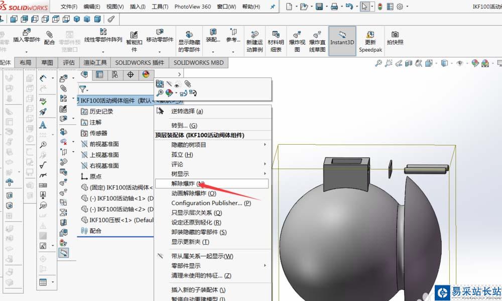 6、如下圖所示,右鍵單擊裝配體名稱,在菜單中單擊“接觸爆炸”,視圖恢復(fù)至原狀。