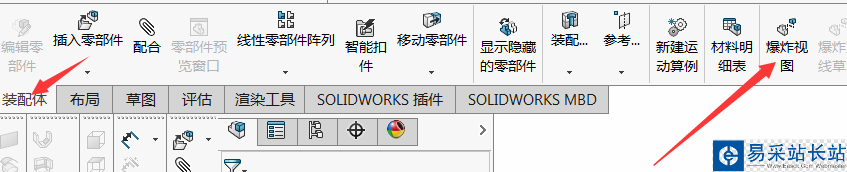 2、切換到裝配體模塊下,然后在上方工具欄處找到“爆炸視圖”命令,