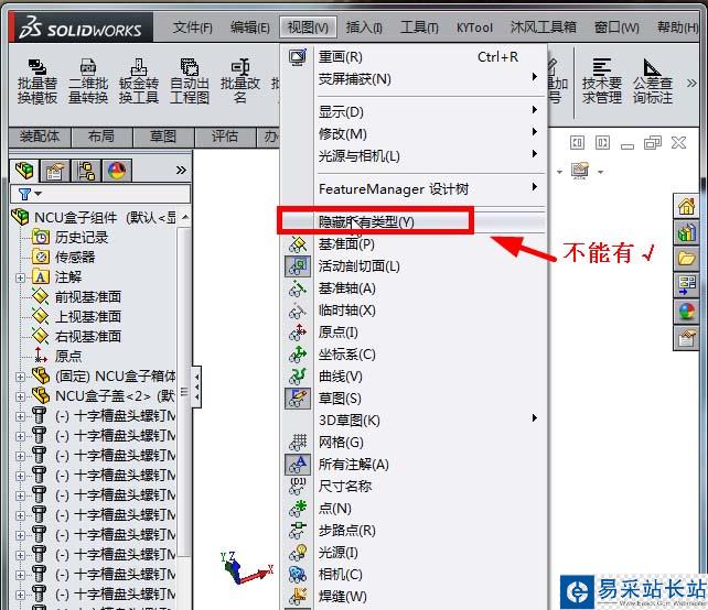 4、另外,裝配體太多零件,你想隱藏一些零件的坐標系,而只保留個別零件的坐標系,怎么操作呢,在設(shè)計樹下面找到原點,點擊隱藏即可