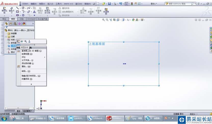 3、打開三維零件繪制界面,左鍵單擊“上視圖”,選擇“草圖繪制”命令,進行面草圖繪制環節。