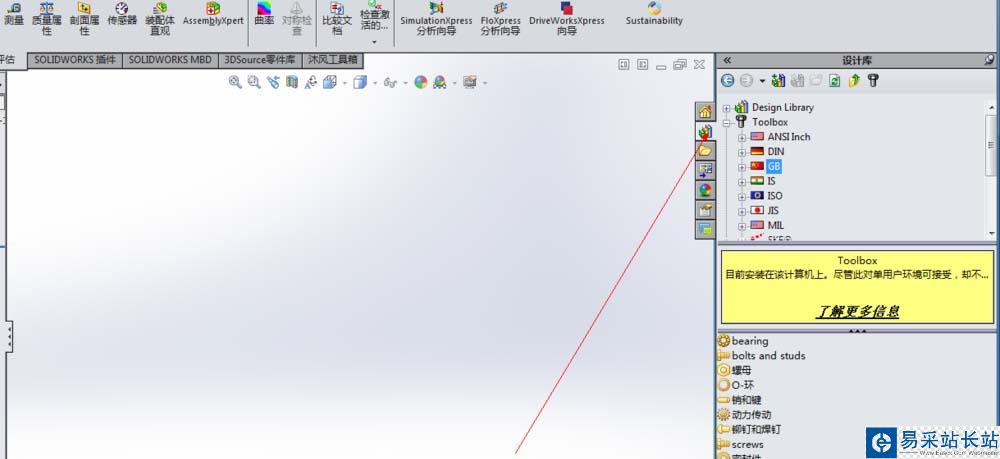 2、然后點擊右側的solidworks資源下邊的設計庫,進入GB 零件選型庫