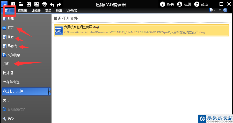 3、可以先看看“CAD編輯器”都有一些什么功能。在最上面的一排的功能是以圖標的形式顯示的。有“打開”“保存”“保存為PDF文檔格式”的等等的一些實用的功能。