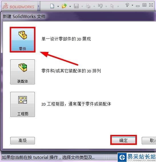3、這里,舉例說明新建零件模式,選擇零件,點擊確定,如圖所示