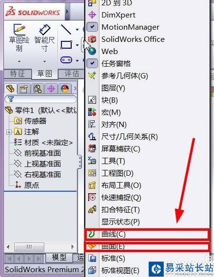 6、假如我想調出“曲線”和“曲面”工具欄,直接點擊即可,(每次點擊只能調出一個工具欄,你需要重復這一過程),如圖所示