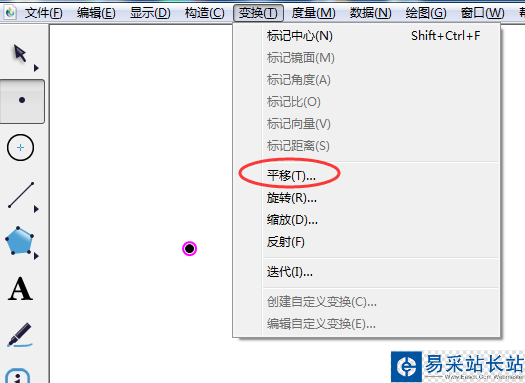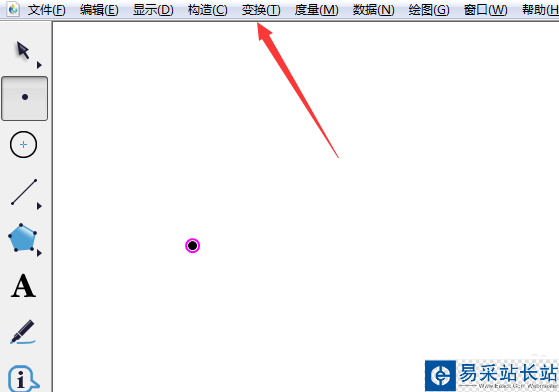 1、啟動幾何畫板,先畫出一個點,并且使用箭頭工具選中它,在菜單欄單擊變換菜單。