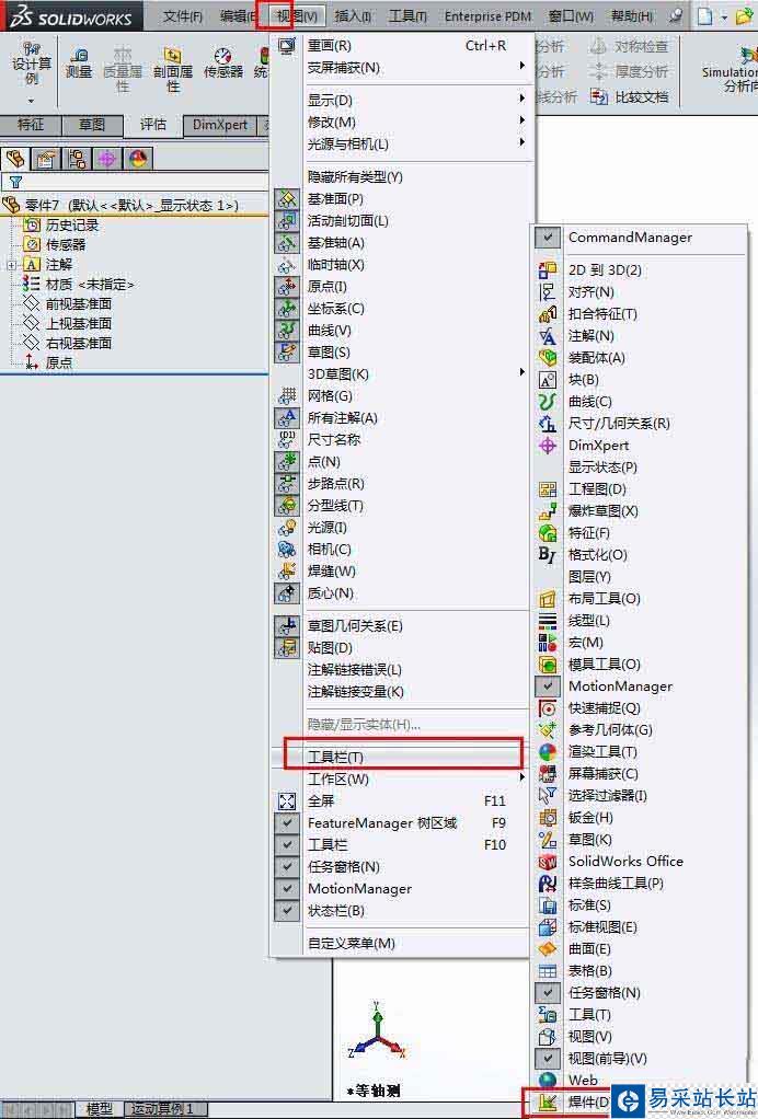 1、調用焊接命令到界面中:視圖/工具欄/勾選焊件
