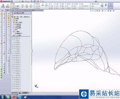 1、3D草圖。首先你得準備一張近似側面的海豚照片將其側解剖線用2D草圖的樣條曲線描出來,作為下面步驟的基線,根據這張圖新建3D草圖,根據圖中體積和陰影關系將海豚細分曲面,于是得到上面的草圖