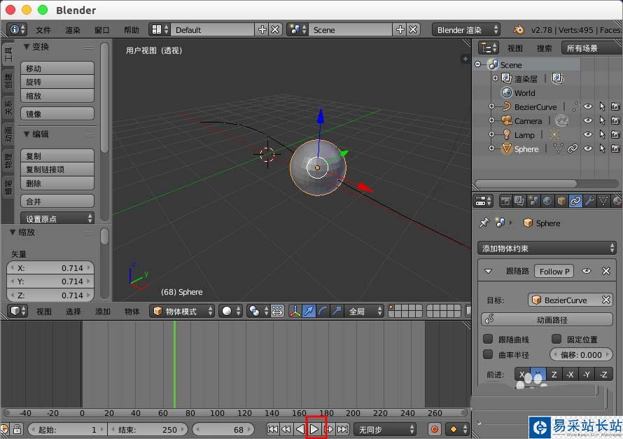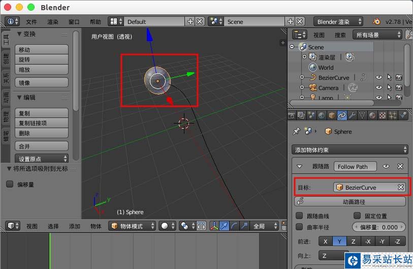 6、在“目標”中選擇“曲線(BezierCurve)”,發現我們的球體會自動約束到曲線的一端,如果不是在一端,需要自己選擇移動上去。