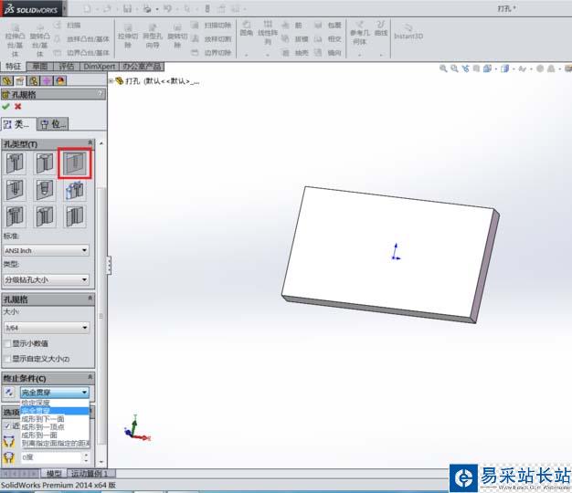 2、異型孔向導:鼠標單擊異型孔向導,界面會自動跳出孔規格選擇欄,根據自己需要選擇孔的類型;如沉頭孔、錐形螺紋孔等。此處選擇孔。