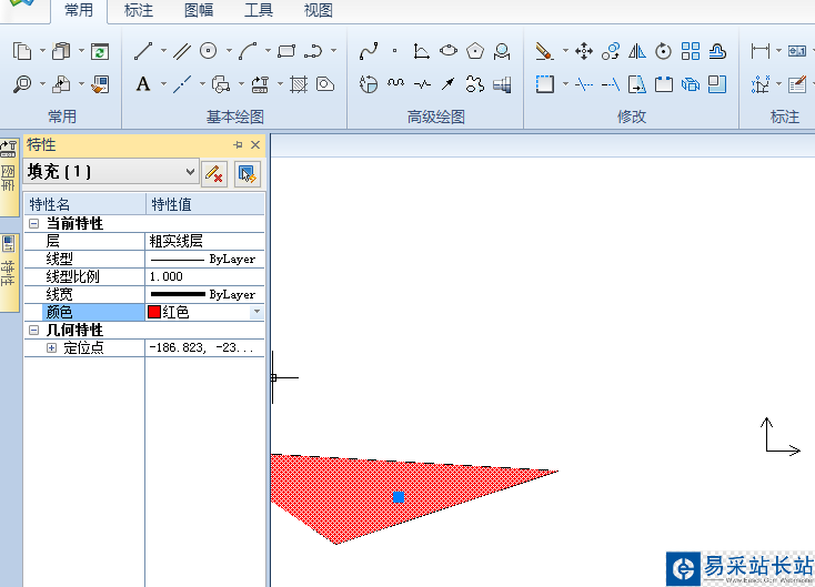 5、雙擊填充區(qū)域可以改變填充的參數(shù),比如線寬,比例,顏色等,這里已顏色為例,將其改為紅,如下圖所示。