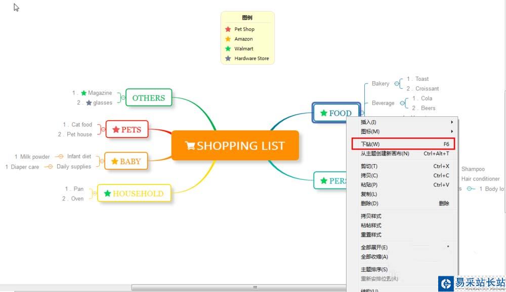 1、在XMind中,選中思維導圖中的一個主題,采用快捷鍵“F6”開啟下鉆功能;當然你也可以右擊主題,選擇下鉆、或在菜單欄選擇“查看>下鉆”。
