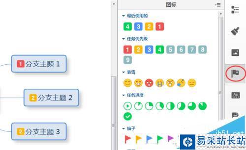 1、在XMind 8中,單擊側邊工具欄中的“圖標”工具,打開圖標視圖;