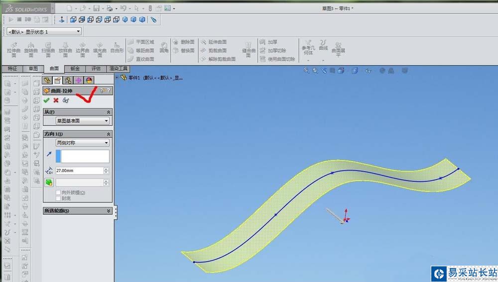 3、用拉伸曲面的方法,把上一步畫(huà)的曲線拉伸成曲面
