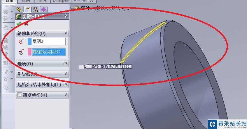 3、如圖做一條緊貼側面的螺旋線,這條螺旋線是作為拉伸切除的引導線
