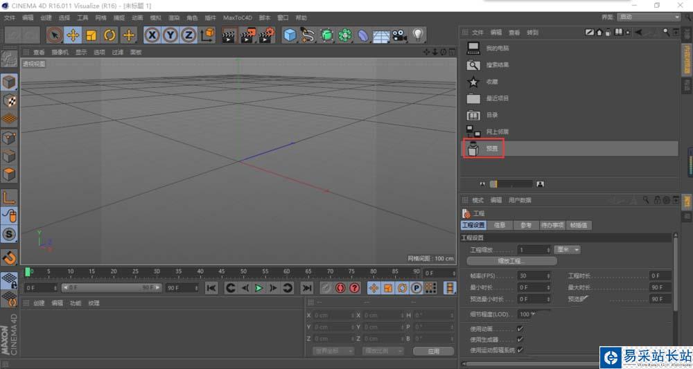 6、打開C4D,點擊內容瀏覽器,點擊預置,點擊我們剛剛導入的C4D預置,里面有我們需要的預置,拖入到左邊的預覽界面或雙擊就可以將預設載入。
