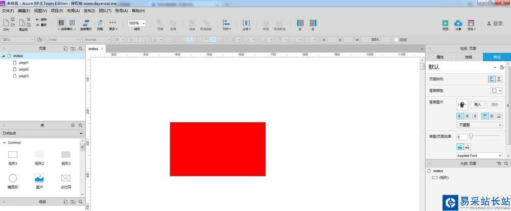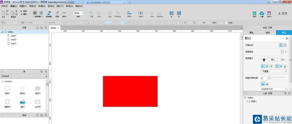 1、在Axure RP8打開新建一個畫布,拖動一個矩形元件到畫布中;