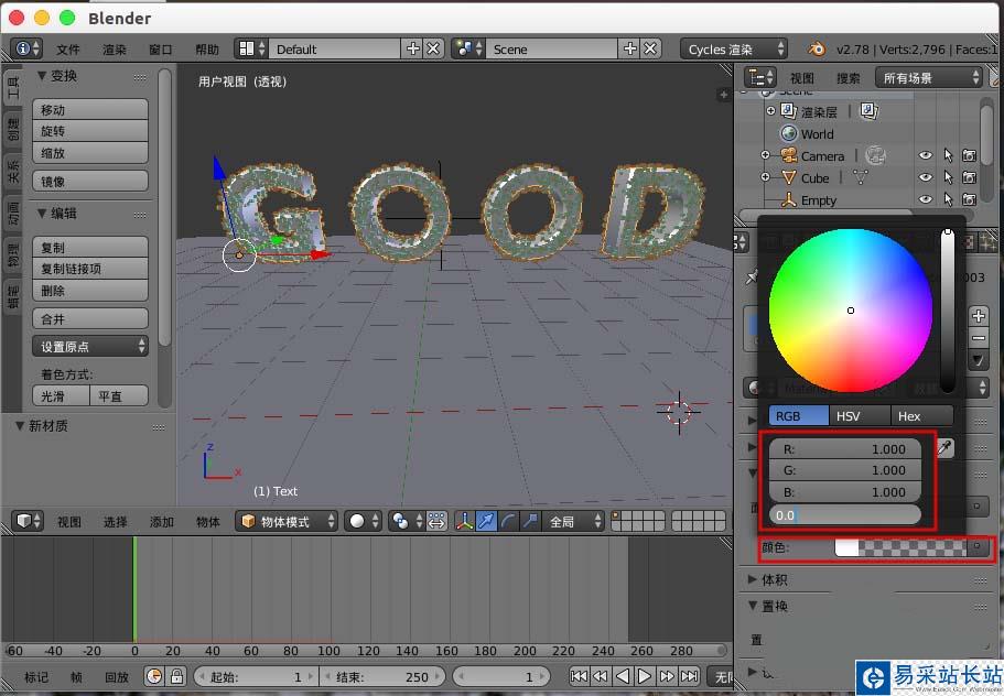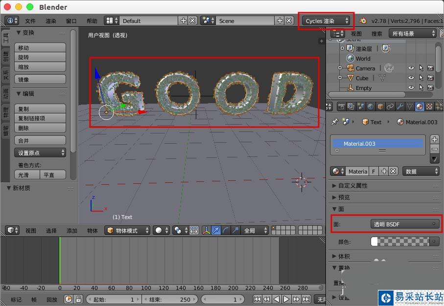 9、選擇“Cycles渲染”,添加材質,面選擇“透明BSDF”。