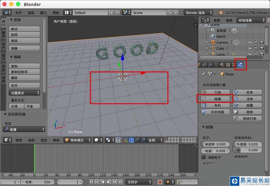 7、創建一個“平面”作為地面,添加物理“碰撞”。