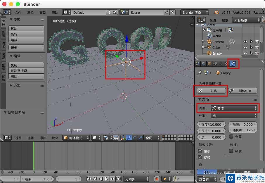 8、創建一個“空物體”,添加“力場”,類型選擇“紊流”。