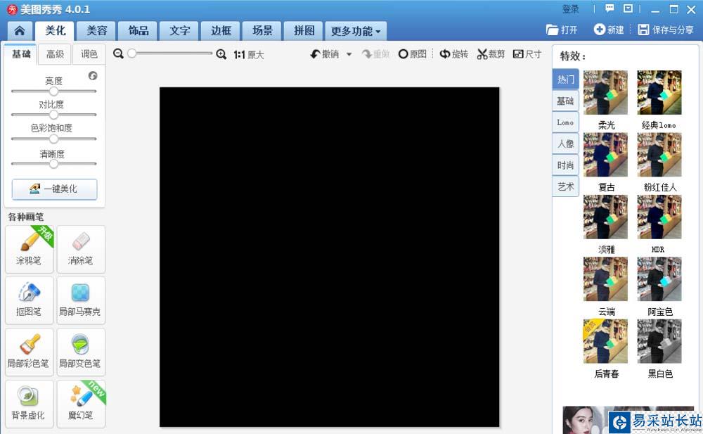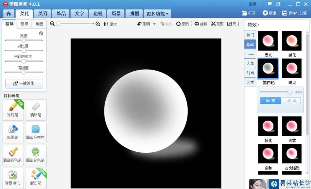 4、點擊“美化”中的“基礎(chǔ)”,在點擊“黑白色”和“反色”,并保存。