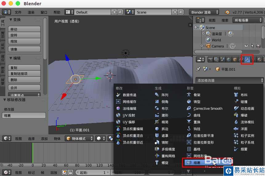 3、屬性導航中選擇“修改”,添加“縮裹”修改器。