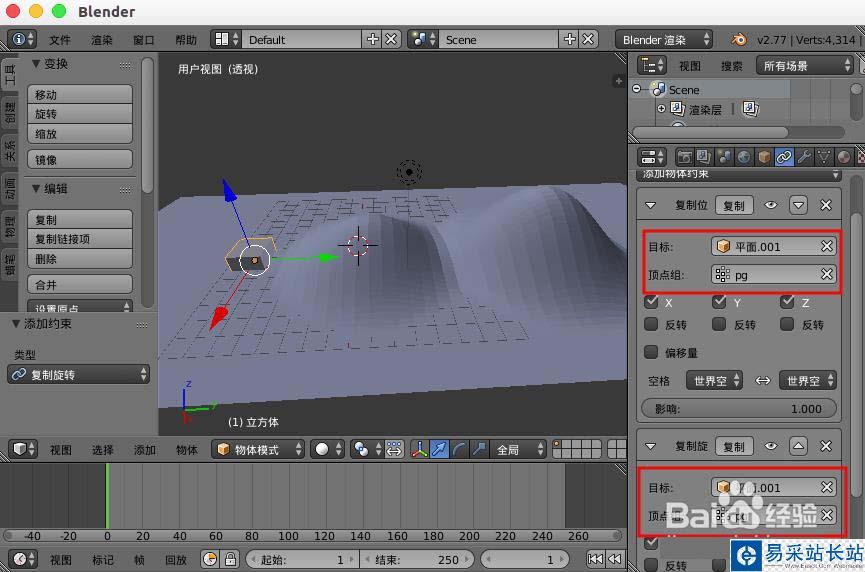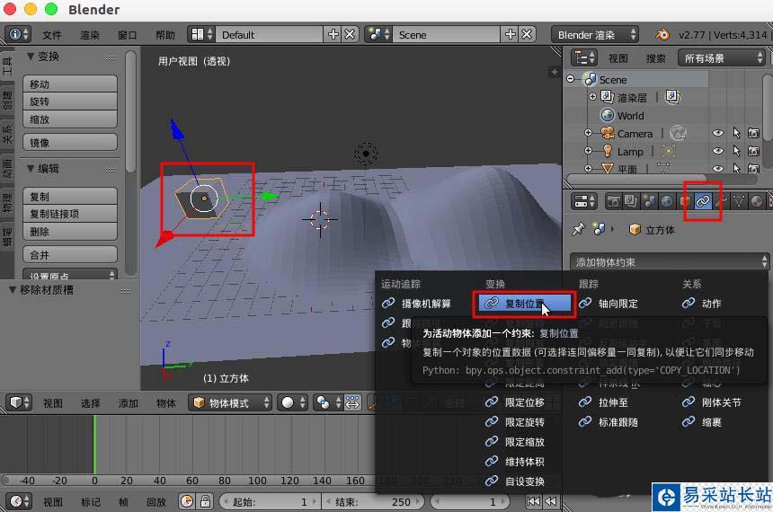 7、選擇“立方體”,右邊屬性中選擇“約束”,分別添加“復制位置”與“復制旋轉”約束。