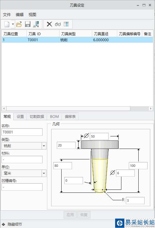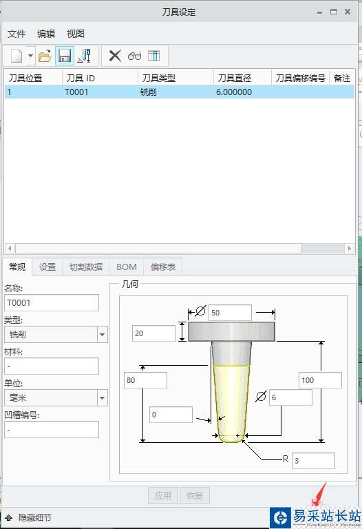 5、彈出刀具設置,選中T0001刀具,單擊”刀具對話框“中的”確定“