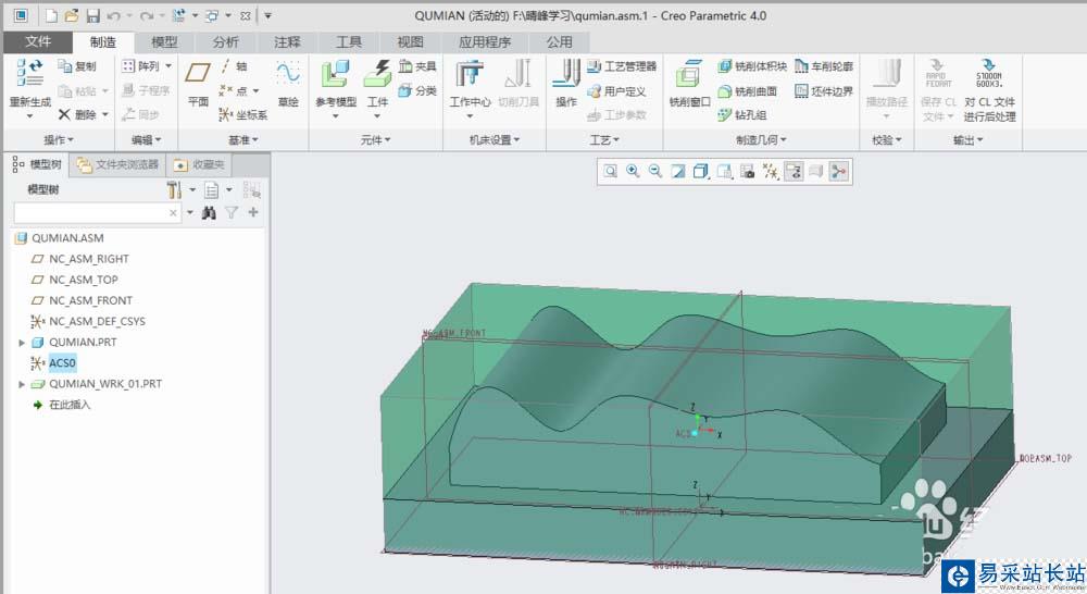 1、打開creo4.0軟件,創建一個數控編程文件。引入參考模型及創建工件。