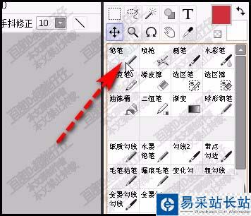 2、鼠標移到右側這里,選擇:鉛筆工具,此時,鼠標呈一個白色箭頭加一個小圓圈。