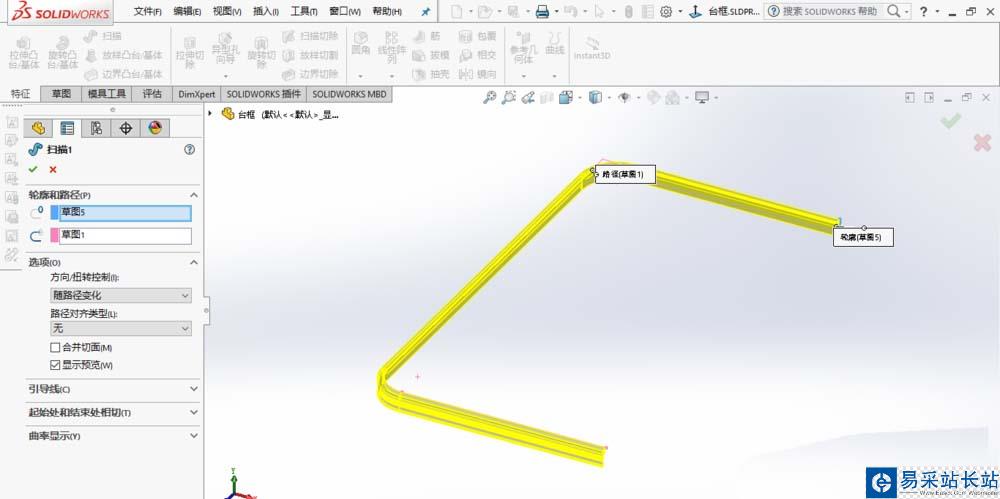 4、采用掃描特征命令,選擇好草圖輪廓和路徑,點擊確定。