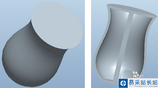 6、若第四步中選擇加厚10,并且將旋轉角度調整為180,則旋轉而成的實體如下所示,即每條邊均偏移了10mm形成了一個殼體。