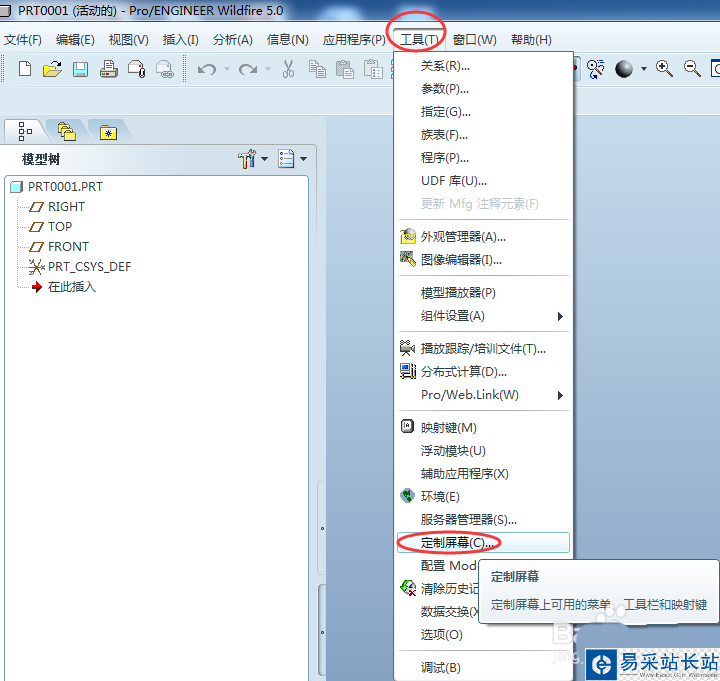 1、打開Pro/E軟件,依次點擊“工具”-“定制屏幕”。