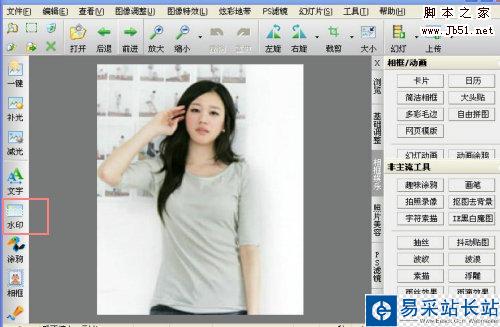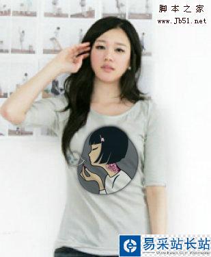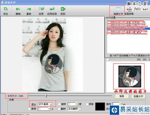 2.選擇好水印。 選擇混合——正片疊底。這個選項非常重要,它能夠讓水印圖片“融”入背景圖片,產生一體的感覺,連衣服上有褶皺的地方,融入后還是會有褶皺。 調節水印大小和旋轉角度 。 圖案就很自然的加在T恤上了。